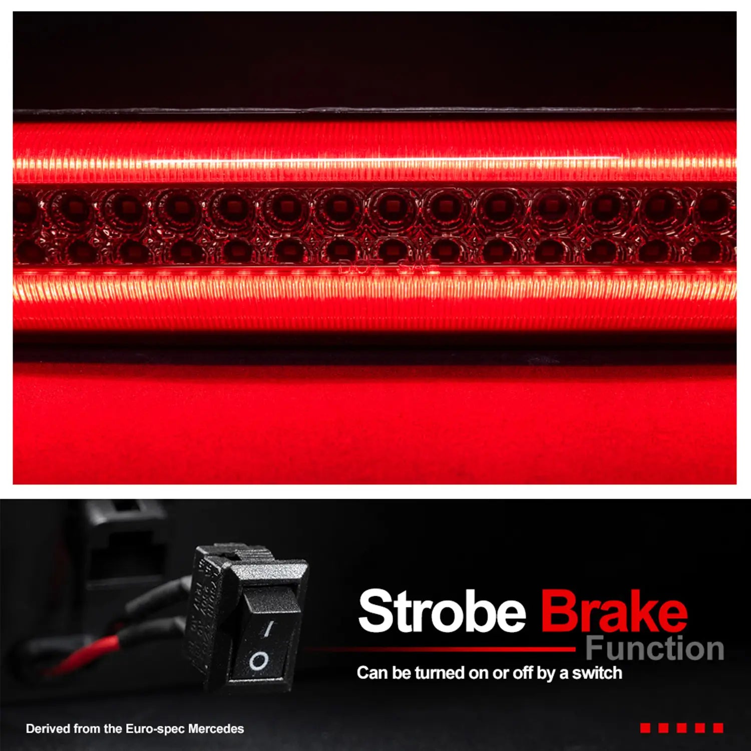 • F1 Style Strobe Design: When you initially step on the brake, it flashes 5 times quickly then stays fully on until you lift your foot off the brake. The quick flash can be activated or deactivated with the switch.
