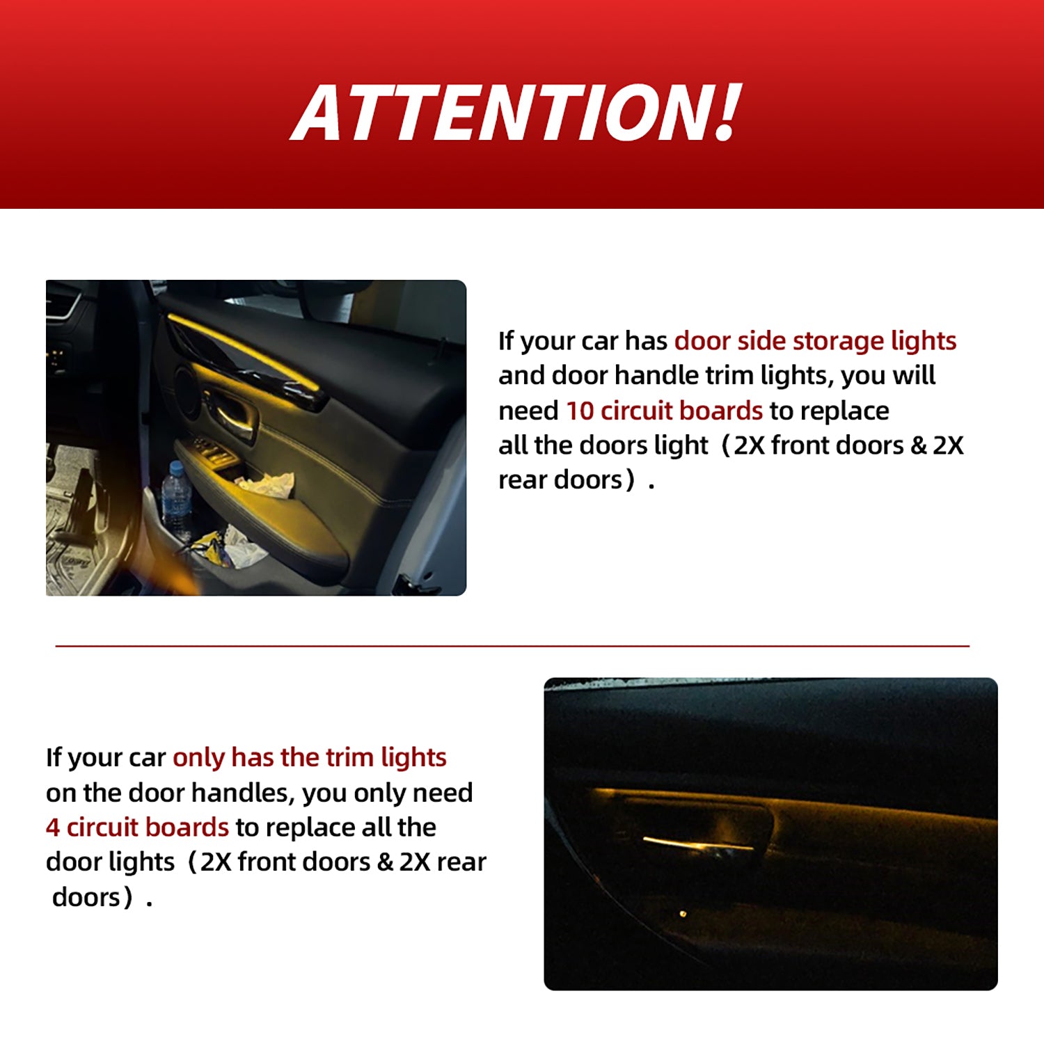 • Si votre voiture n'est équipée que des enjoliveurs de poignées de porte, vous aurez besoin de quatre circuits imprimés pour remplacer tous les éclairages de porte. Si votre voiture est équipée à la fois d'éclairages de rangement latéraux et d'éclairages de poignées de porte, vous aurez besoin de dix circuits imprimés. Veuillez donc vérifier votre modèle avant l'achat !