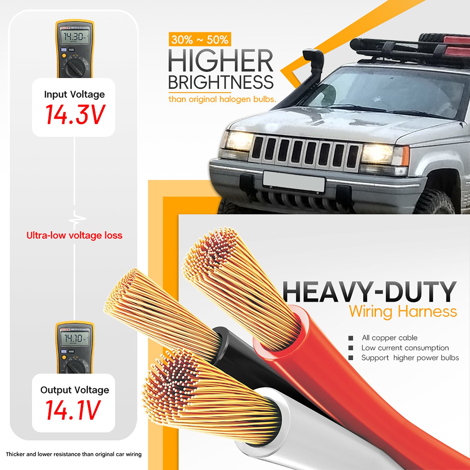 • With low current consumption, this heavy-duty wiring harness can support higher power bulbs.